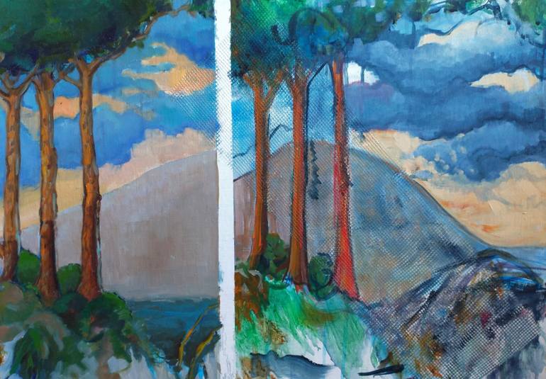 This work is handpainted on gessoed cardboard with an added element of fiberglass tape, using acrylic and oil paints, as well as sanguine and crayons. Picturing two similar, yet altered by time tranquil scenes, that feature trees on a small abundantly green cliff, shifting clouds and a mountain fi...