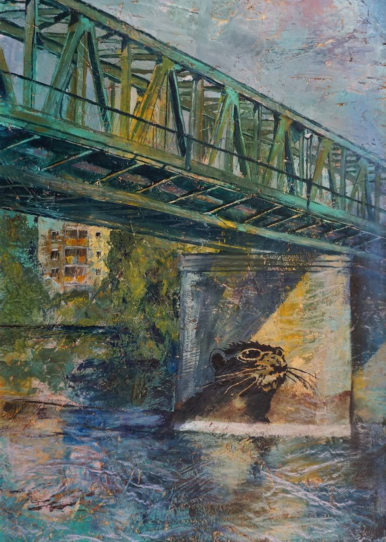 The Northern Railway Connecting Bridge (Budapest, Hungary) lies between the two opposite banks of the Danube. This bridge and its plinth are depicted in the painting. The bridge deck itself is infinitely boring. I was playing with the idea: what if a Banksy painting was over it to cheer up the beach...