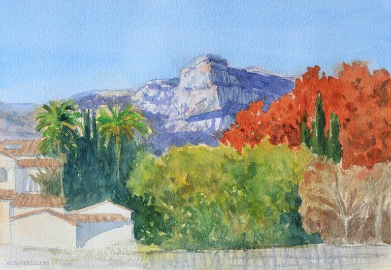 Baou de St Jeannet, Provence, watercolor on paper. Famous mountain near Nice, in Provence, French Riviera. The word "baou" means "montain" in language of Provence.