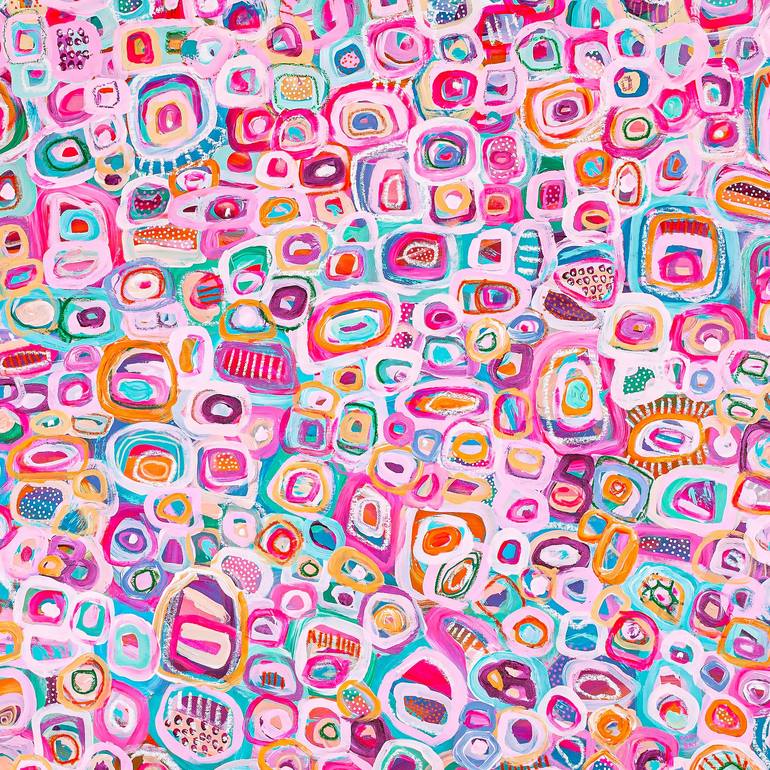 *ON EXHIBITION Until March 2026* READY TO HANG! Original painting on stretched canvas. For serious pink lovers! Colorful, bold and cheerful abstract artwork painted in my “bubbles” style. Pattern of concentric circles, polka dots, lines and many other details. Color palette: Lots of pink - incl...