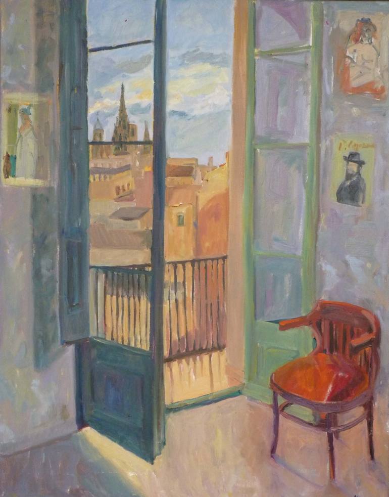 The initial idea of this painting was that it be part of a series of three works. Although each of them works independently. Thus, to paint we start from the same frame with variations (the armchair will be a chair or in the next frame they will disappear). First painting with the balcony closed, se...