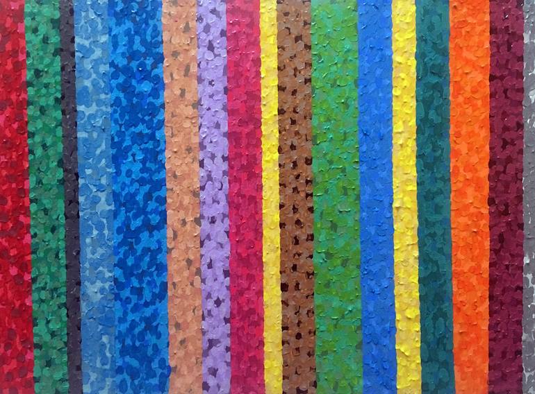 This is the third in my series of barcode paintings. Using thousands of brushstrokes across the canvas in small dots with no lines painted, this work is one of three canvases sold as a triptych. However, here it is available as a print.
