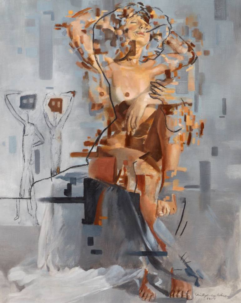 Christopher Lee Gilmer is a self-taught American-Filipino artist known for his surreal and dreamlike paintings. His work often explores themes of mental health, mythology, and the human condition. Gilmer's art career began after a period of hospitalization for depression and hallucinations. During this time, he was inspired by the work of Salvador Dali and began to use art as a form of catharsis. Chris is inspired by data moshing, quantum mechanics, and the oversaturation of images of life as he creates artwork that explores the psychological effects of each physical mutation as if multiple universes merge in time one after another. He explores the disparate outcomes of candid moments as one singular reality by using a cubist framework. Often blurring the lines between realism and expressionist art, sometimes adding primitive line art to entangling almost parallel poses.