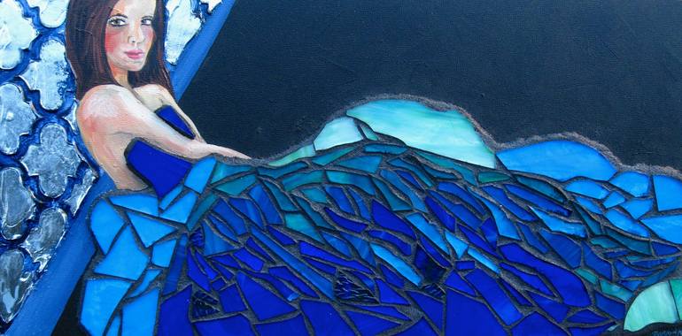 "Bathsheba" the artwork is as layered as Bathsheba the woman. Cradled wood panel with painted edges, wired to hang with a single nail, serves as the base. First came the drawing and inlay of custom cut glass. The glass was grouted with black cement. Inky black sky painted in to match the grout wi...