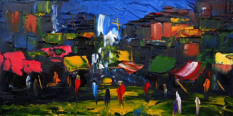 I try to bring out here how coulourful and busy our bazaars are despite the conflict, with people bustling about even at night. Pained with a palette knife,
