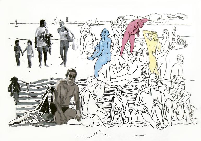The picture show a beach in different places and differen styles. Mixed media.