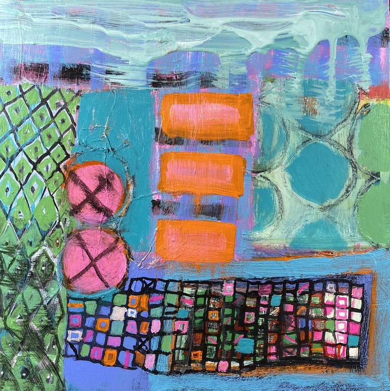 This painting is inspired by bold color, pattern and texture. It is painted on a cradled wood panel. The edges of the panel are painted black. The piece will be signed on the front and is signed, titled and dated on the reverse. Hardware is attached and it is ready to hang.