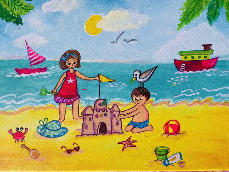 Beach fun time! Inspired by a recent holiday at the beach front. Kids enjoying making sand castles and playing in the waves.
