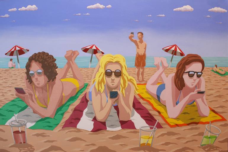 Everybody's on the phone at the beach! I love the bright colors and the people in a beach scene, and I added my own twist - everybody's looking at their phone. This painting was created from my imagination, in a sketch book, and then redrawn and painted on the canvas. This is a nice heavy-duty canva...