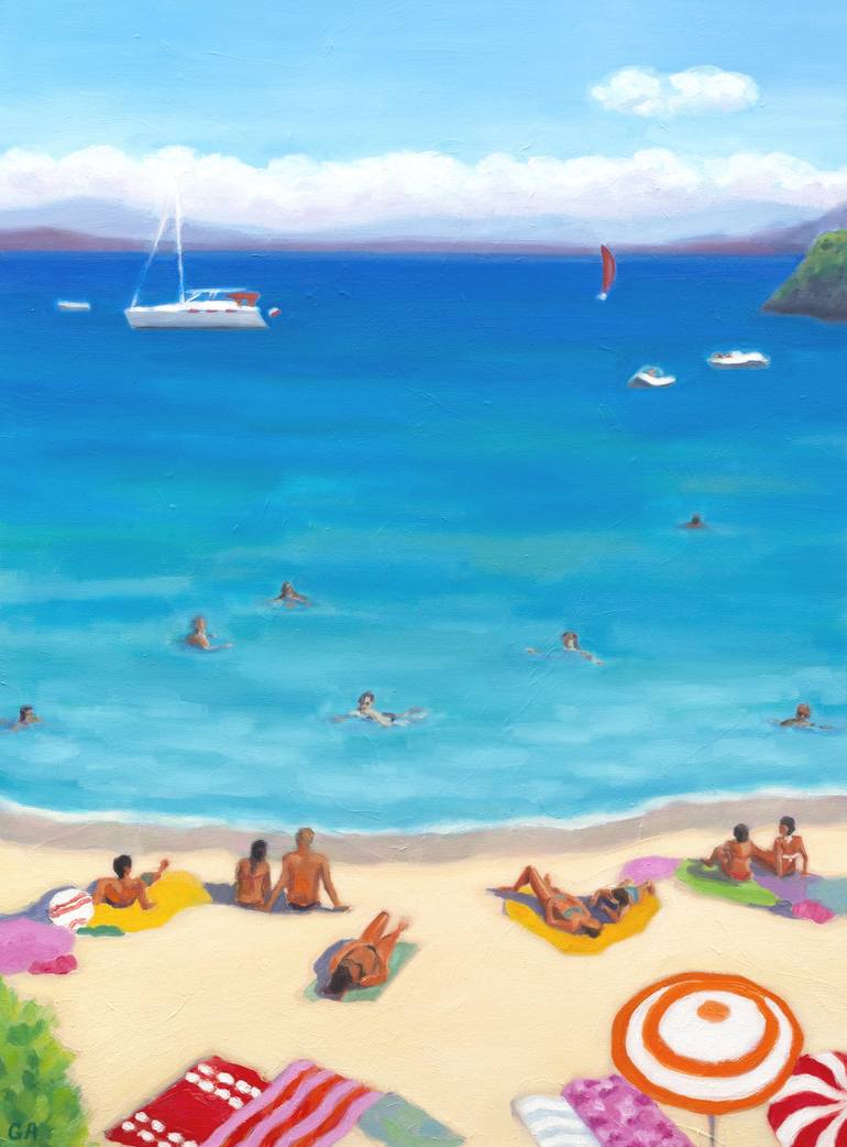 People on the beach seascape oil painting on textured canvas. The painting of the beach scene with colorful umbrellas, towels, and boats in the distance was inspired by wonderful vacations by the sea. The painting is ready to hang with hanging hardware attached to the back of the painting.