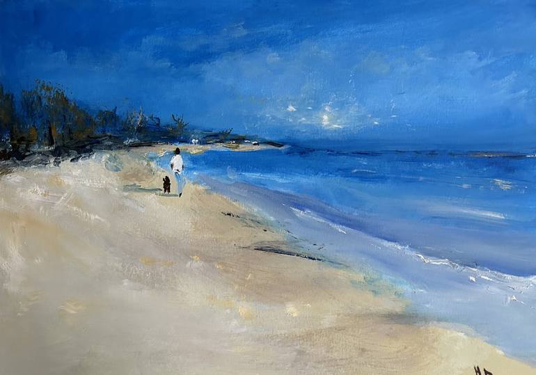 Impression of a man walking his dog along the beach on a blue-sky day
