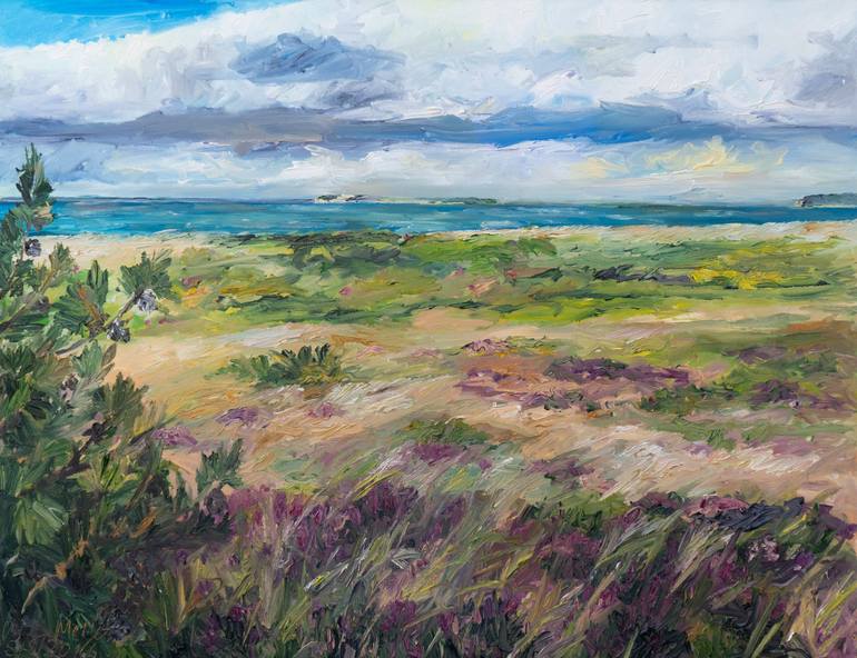 It was a very windy day in August on the Danish island of Samsø. I set up my easel in the lee of a small pine forest and captured the blue-green sea and the heath landscape under the moving cloudy sky in an impressionistic way. My brushstrokes are bold and expressive and show the wind direction of t...