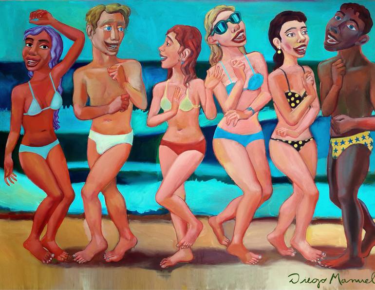 painting of the series on the beach, where boys and girls dance, pose, have fun, with the sea in the background