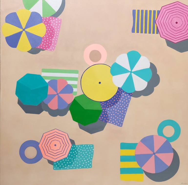 Holidays at home. Maritime art to feel good, relax and unwind. It should put the viewer in a holiday mood and bring a lot of joy. To take away the stress from work when he comes home. Beach, sea and colourful parasols in strong colours and colour combinations from a bird's eye view. My paintings a...