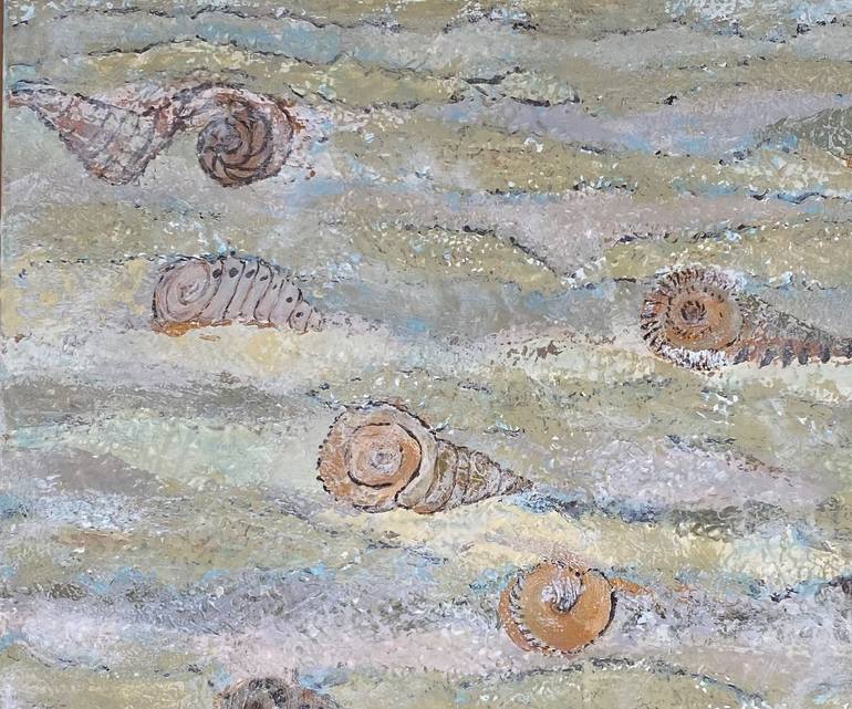 I did this work by mixing titanium white with milky, olive and brown colors. There is also a little blue, green and purple shades. In order to transfer the colors of a sandy seaside with many seashells. It turned out very gently and as calmly as possible.