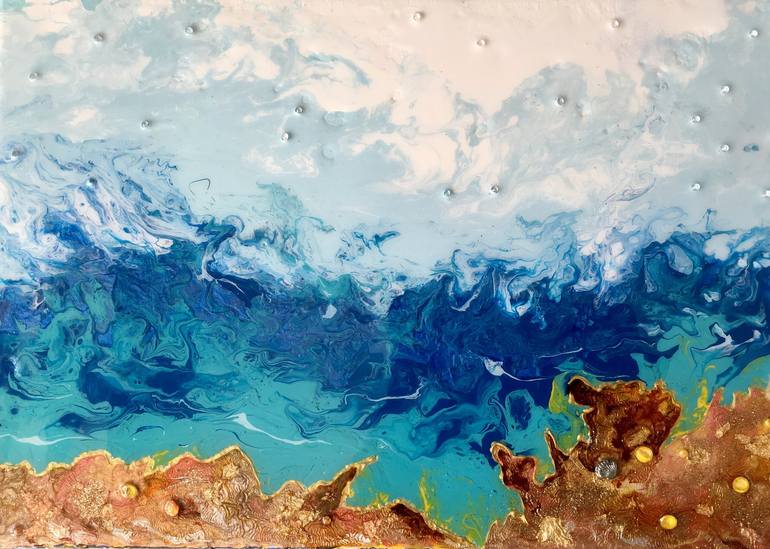 An original abstract painting using fluid acrylics, oils and ephemera on stretched canvas, inspired by the love of improvisation. Finished with glossy resin. The painting features an abstract depiction of an ocean scene. The artwork uses a mix of blues and turquoise to represent the sea, with white...
