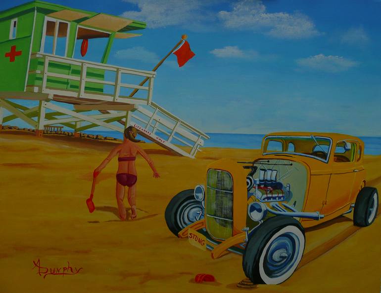 The Little Deuce Coupe from Beach Boys fame is here again on the beach ready for some summertime fun. This painting has been done on durable canvas paper and coated with a clear varnish to protect the surface from dust and harmful sunlight. It is 40X50 centimeters which comes to 16X20 inches.
