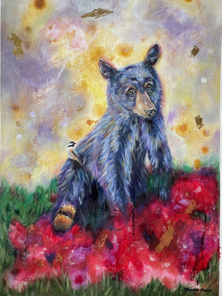 This mixed media oil painting in abstract realism style shows a black bear with a chickadee bird hanging out in a red poppy flower field. With spontaneous drips, beautiful details and shiny touches of (imitation) gold leaf, this painting captures a love for wildlife in bold colors and brushstrokes. ...