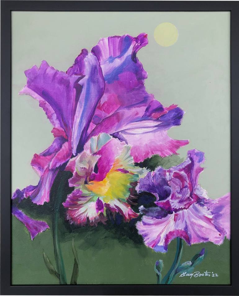 I've experienced many cloudy days recently, so I decided to paint this colorful interpretation of a bearded iris, trying to bring some cheer this overcast world. I paint mostly in acrylics for the versatility of the medium. This painting has a simple, black frame, and is wired for hanging.