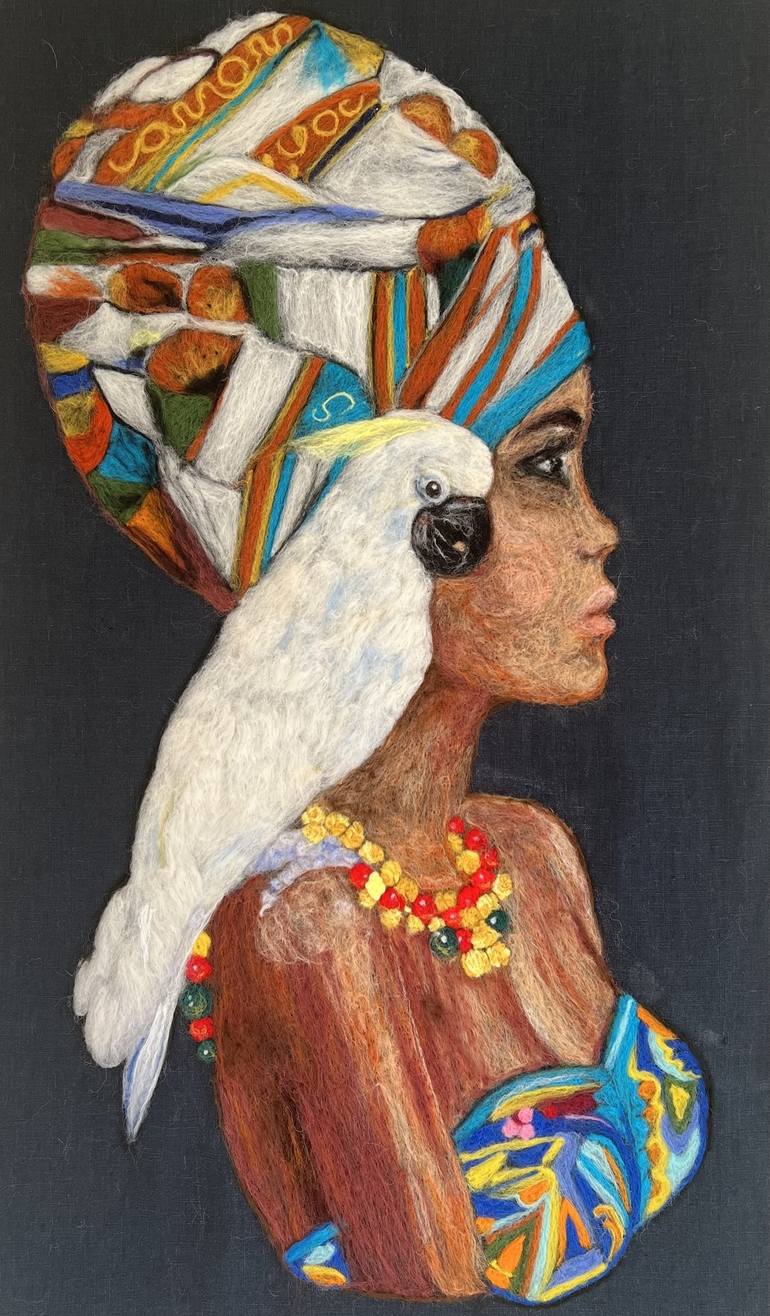 Beautiful woman with the bird was created in inspiration of foroshoot of one model, needle felted on a dark linen and stretched over a canvas frame. This beautiful woman with a parrot. This work is very pleasent to touch because of his material - wool and has appearence of 3D. The art is signed on ...