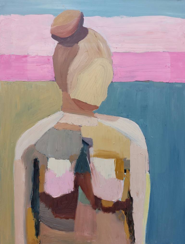 Beauty is a colorful painting. It is painted with oil. The technique is rough, painted with spatella and large brushed. The colors are aesthetic held in harmonically nuances. The woman is facing her face downward. The context is hidden so that this woman stands out clear.