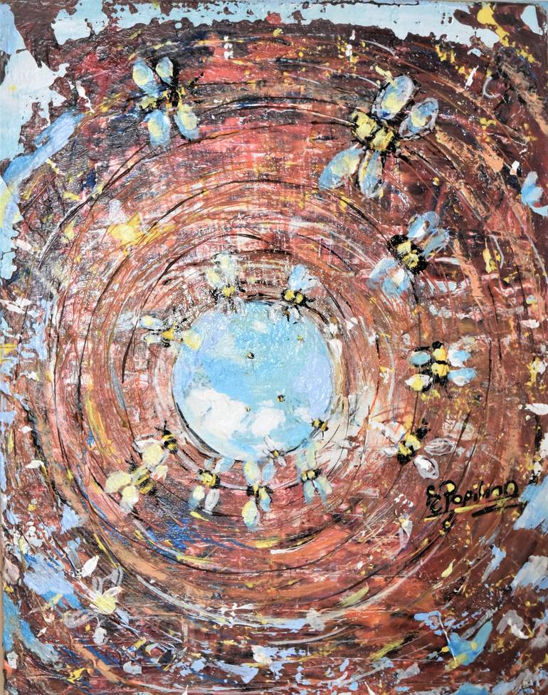 Bees are associated with goddesses, religion, and ancient cities. Bringers of life and abundance, bees are fun to watch. This is a fun abstract piece, very textural, built with layers of paint.