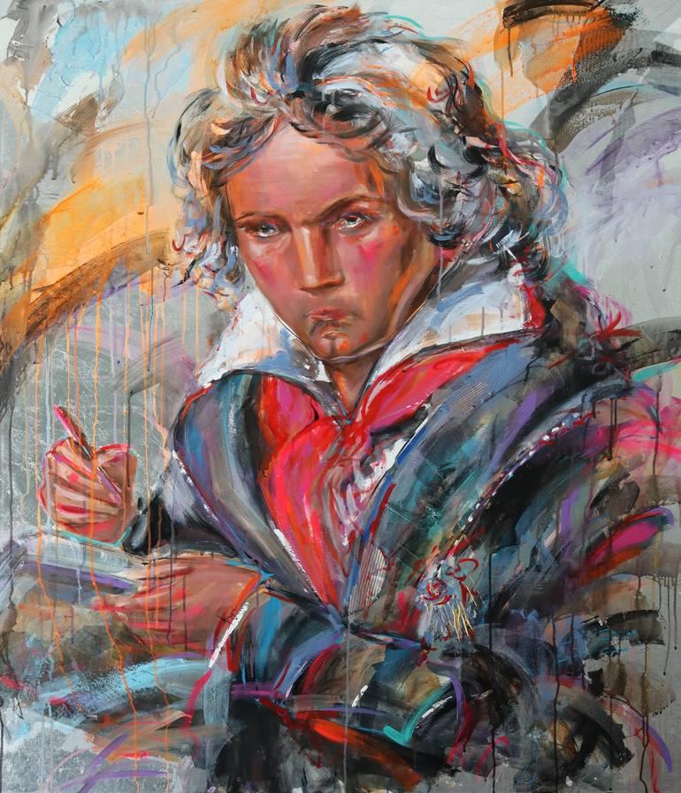 Ludwig van Beethoven portrait on canvas. Acrylics,fabric and silver leaf on canvas. Sides are painted.