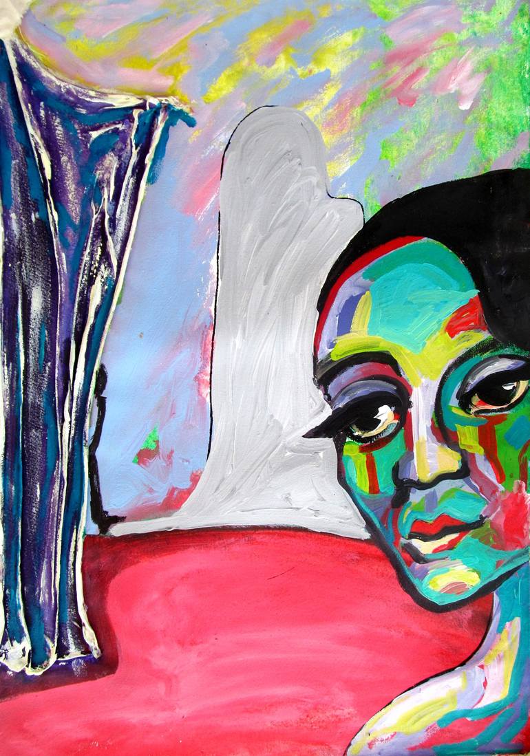 " Detrás de escena " está inspirada en un artista que se oculta detrás de los telones del escenario observando al público que espera que comience la función. Hay tensión y expectativa en el ambiente. El público espera que comience la función. La obra fue realizada en óleo, acrílico y empaste sobre l...