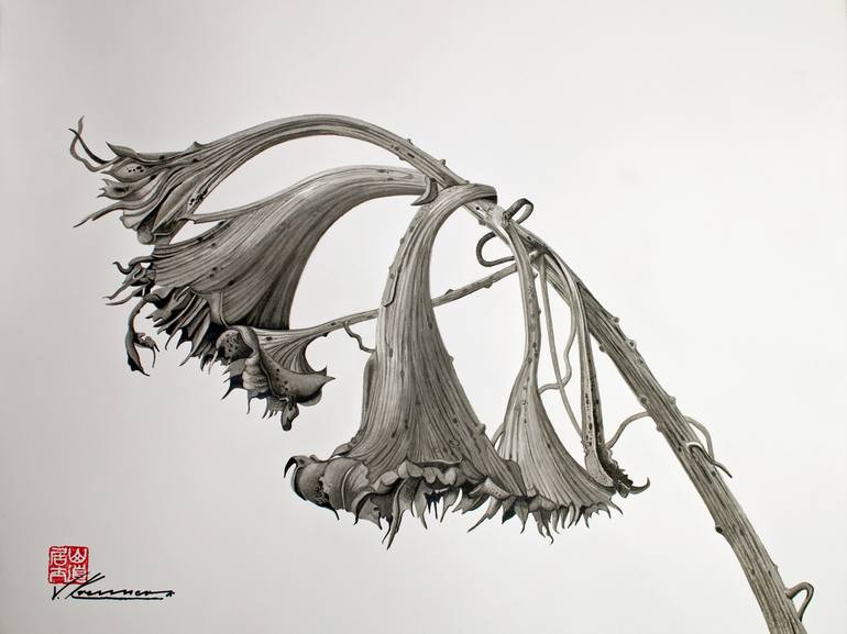 black and white brush and ink painting of a wilted bell flowers