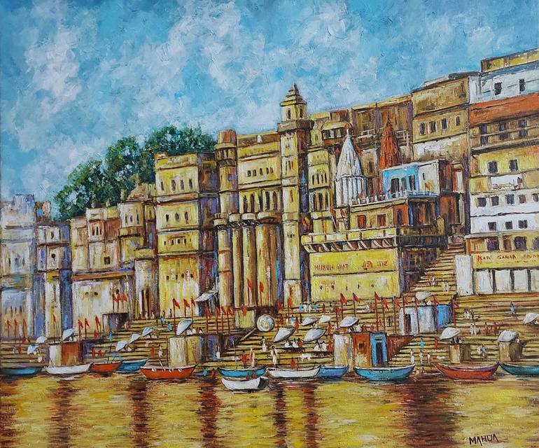 This water color composition captures one of the many ghats at Varanasi by the river Ganga. Varanasi is considered to be one of the holiest places by the Hindus. I have always been fascinated by the mysticism surrounding Varanasi and have adopted it in many of my art works in different mediums, this...