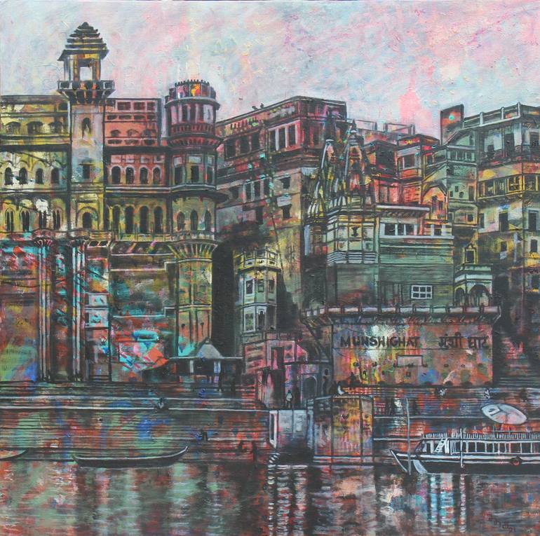 The colorful life in this very ancient city, unchanged mostly in the last thousand years, is the inspiration behind this painting. The rich, living traditions in music, dance, religion, philosophy, food and almost every aspect of Indian culture are a constant source of wonder.....'Benaras ke rang' a...