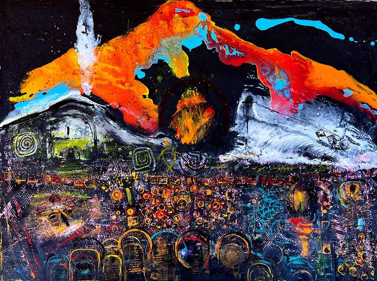Imaginary landscape of archetype New Mexico mountain. Legends of unexplained sounds and sightings abound. Colorful experimental action printing.