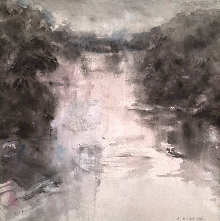 This is a view of a river on the island of Java in Indonesia. It has a mythical significance for its inhabitants. I try to use abstraction and reduced colors to paint the river in such a way that it makes every viewer think this landscape seems familiar.