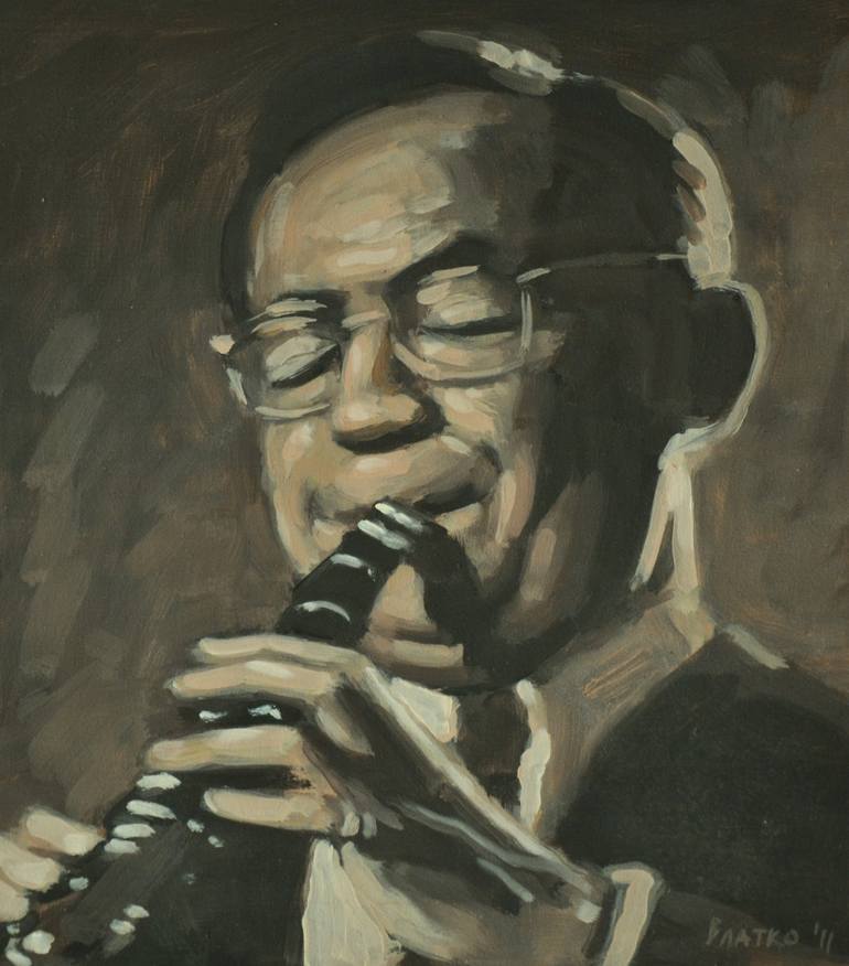 Portrait of Benny Goodman, done in impressionistic manner, oil on canvas with sepia shades.
