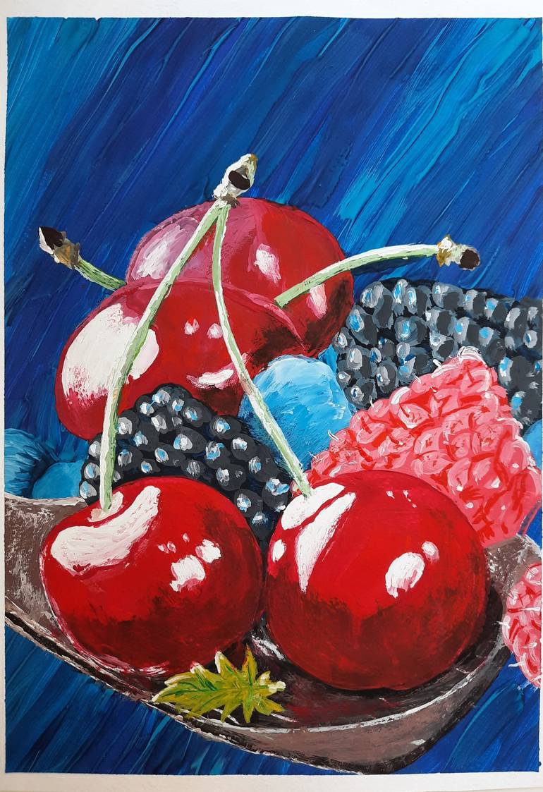 Juicy berries of different colors and shapes are located on a wooden plate: ripe red cherries, black blackberries, sweet raspberries, blueberries. Fresh and appetizing. A mint leaf decorates the composition and gives it a special freshness. This still life exudes pleasant fruity aromas and makes ...