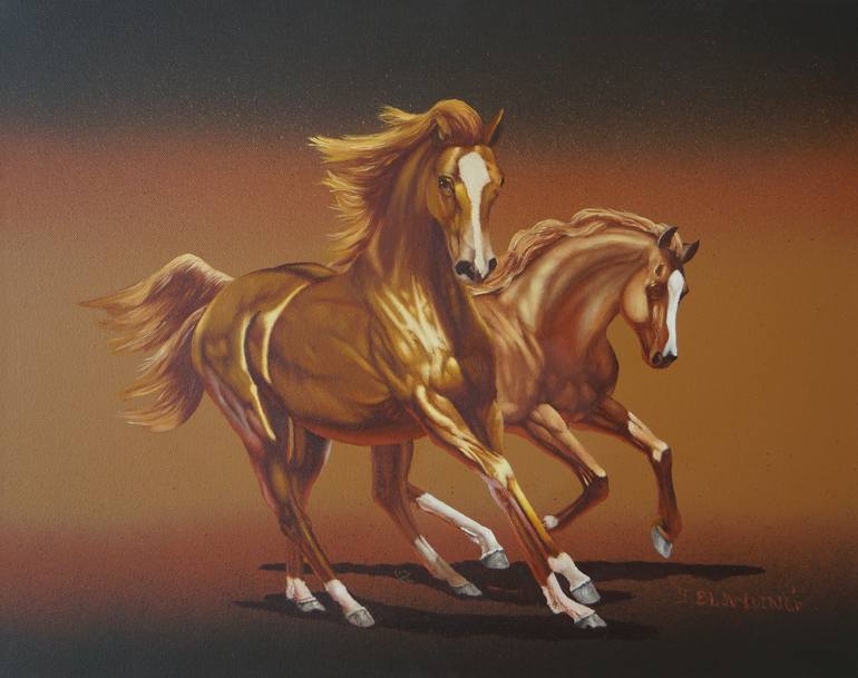 Two spirited horses, romping around the corral, side by side, wind blowing through their manes, not a care in the world, happy to be “best friends”. The painting is on stretched canvas with a gallery wrap that is painted as an extension of the background. It is unframed.