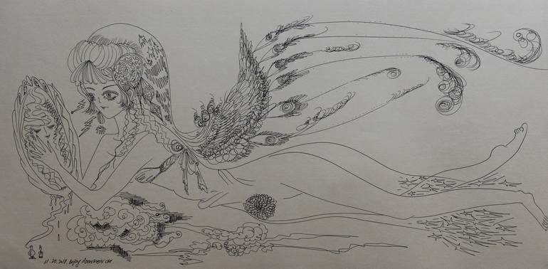 Best Wishes number 5 is about a very beautiful girl with wings and looking at mirror. Meth and muse. writing by Poonkanchi 2020 DEC 26 ---------------------------------------------------------- With a new wood frame ready to hang on wall.