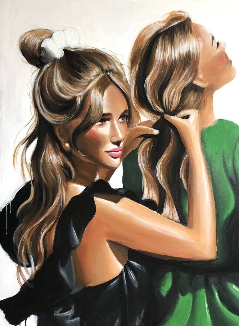 Maria Folger is a photorealist painter who lives in Los Angeles. She uses acrylic and oil paint to create portraits of women, playing on sexuality and femininity. Maria often depicts lingerie-clad beauties, vampy red lips, and patent heels but juxtaposes these subjects with pizza slices and pineapples, adding a humorous tone to some of her sensual works.