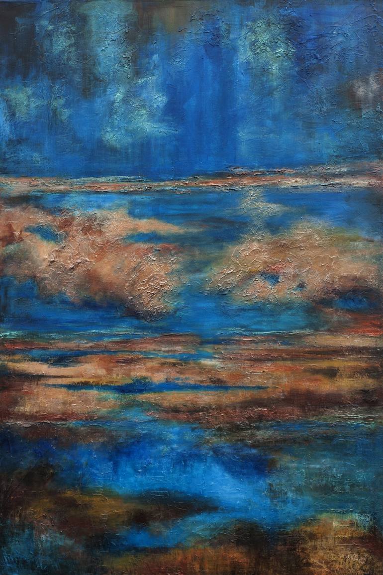 An abstract piece of Modern art. Its done on a canvas and has beautiful textures. The painting is enhanced with varying textures and is done on a good, large sized box canvas. The original piece is for sale and will look wonderful on a good sized wall.