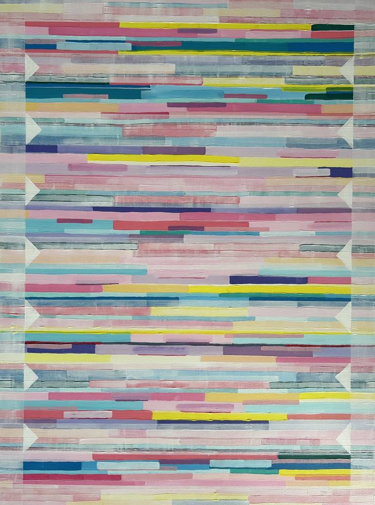 Acrylic paint on Italian gallery-grade stretched canvas. The painting has been sealed with a gloss varnish to protect it from UV and dust. The artwork continues to the sides of the canvas (2.5cm). This artwork will be shipped in a box and is ready to hang. Beyond the Lines 3 is a geometric abstract...