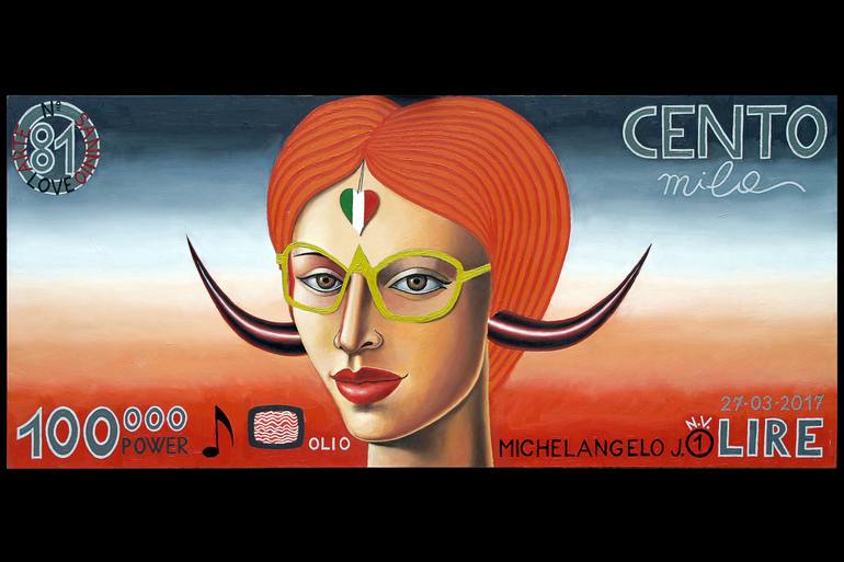 The work is inspired by the series of small watercolors, which I realized between 1995 and 1997; They were a free and ironic interpretation of 100,000 lire banknotes in Italy. The banknotes gave me the chance to overcome the concept, often of a manier style ....