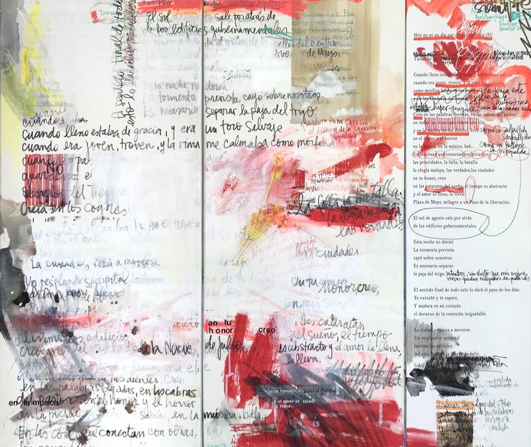 I wrote a new poem from words on three poems that Santiago Llach gave me for this work, and edited it myself while painting on the canvas. As if painting was a performance made by my body wrapping and transforming words...The technique is mixed media on canson paper marouflage to a canvas mounted on...