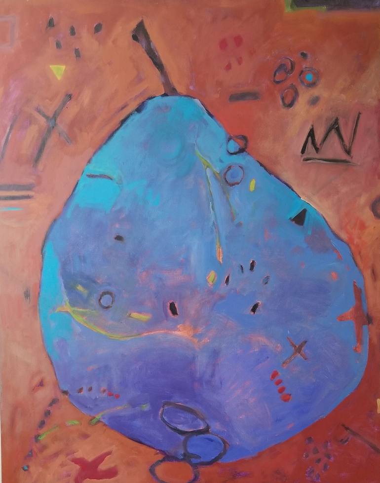 Something about pears. They are human-like to me. I have painted many canvases with pear shapes, but this one is the most expressive. Large, orange and blue blue blue with lots of distractions around and on it, this big blue pear wins my heart every time I look at it. It makes my happy. I think ...
