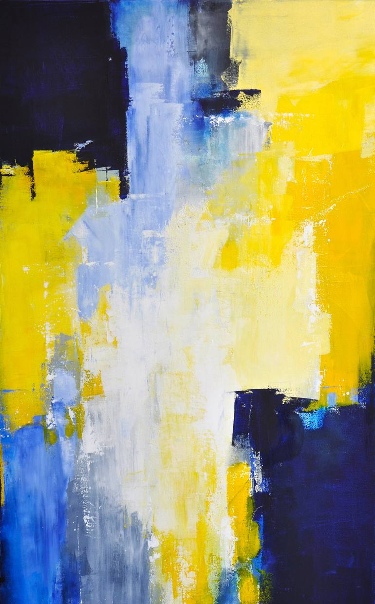 48" x 30" Abstract acrylic painting Deep 1 1/2" canvas Sides are painted black, staple free, ready to hang. Signed and dated on the back. This large abstract painting has been done in shades of cobalt blue, sky blue, sapphire blue, soft yellow, sunshine yellow, white, gray, and ultramarine blue. Fin...