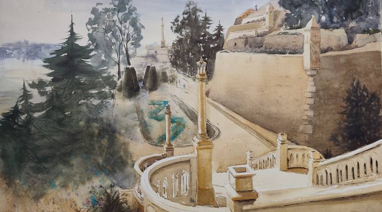 This original watercolor painting captures a panoramic view of Belgrade from the grand staircase of Kalemegdan. The architecture is rendered in delicate detail, showcasing a blend of realism and impressionism. The artwork, created in 2025, evokes a sense of classicism and romanticism. The artist's ...