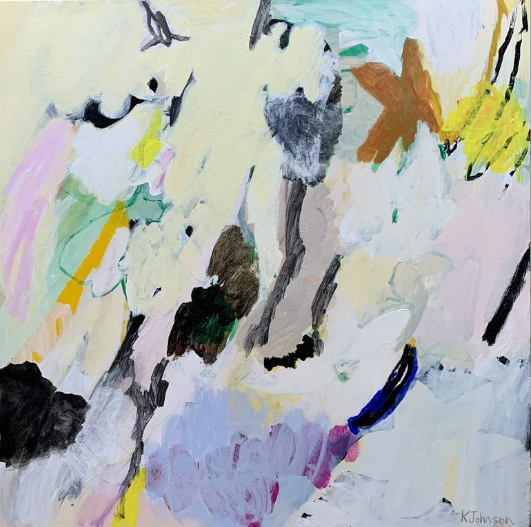 This painting features soft, fluffy flowering shapes along with stripes and dashes of colour.
