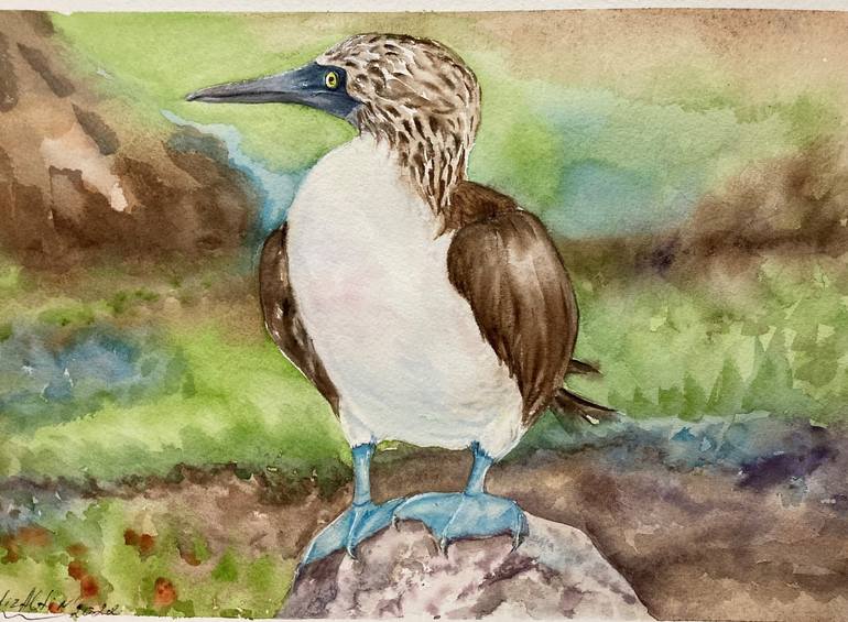 Blue - footed Booby . Seabird . Watercolor original painting . Cold press acid -free 100 % cotton watercolor paper . Signed on a front and a back by artist Liz Altin . Size 9 x 12 inches .
