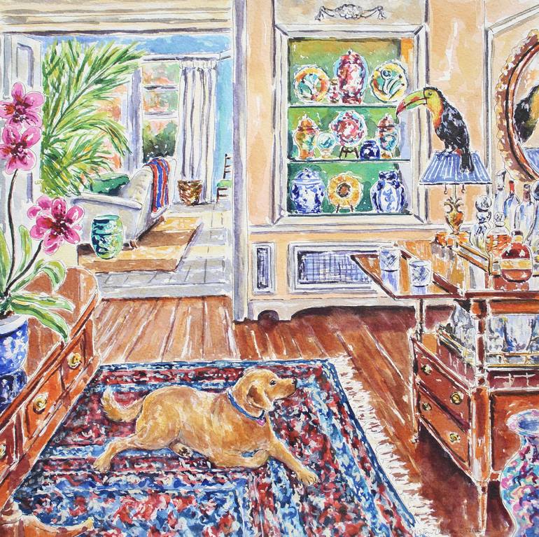 An original 12" x 12" or 31cm x 31cm watercolor and ink painting of a Golden Labrador Retriever and a Toucan in a beautifully decorated room by, "Acquired By Andrea"! This painting was painted with Rembrandt professional watercolours and archival ink on Arches 300gsm all cotton watercolor paper. It ...