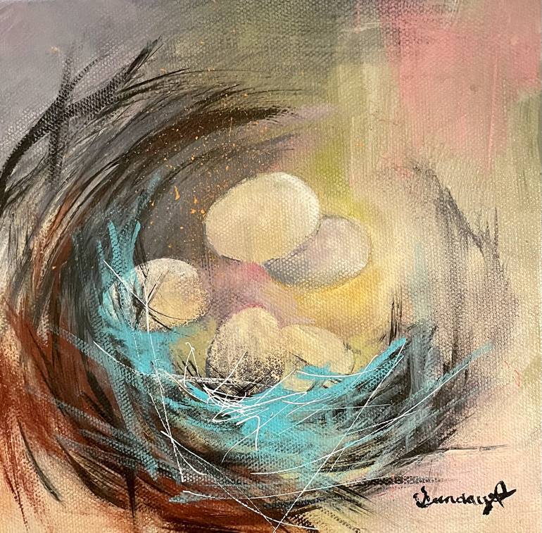 This 8x8 painting is on a canvas. It’s bright colors such as green, yellow, purple, and pink create a light and happy mood. “Birds Nest” is not framed but it’s size allows it to be easily framed and hung. The eggs have various patterns, some smooth or speckled. This is a perfect painting for your ho...