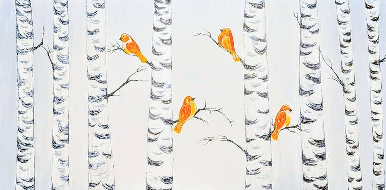 Original abstract painting, Acrylic on Canvas, created in my studio. Professional Grade Acrylic Paint, Acrylic on Stretched Canvas. This piece arrives ready to hang as-is, or is suitable for framing as well. Title: Birds in Aspen Trees Size: 50x100 cm (20"x40") SIGNATURE: Always signed. Either on t...